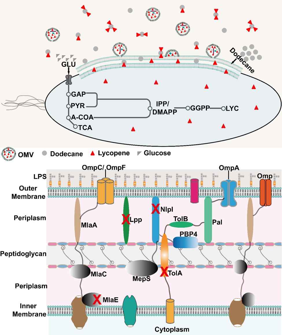 番茄红素是一种无环四萜(C40),是一种长的亲脂性化合物,能使番茄、番石榴和西瓜等植物呈现出独特的红色。番茄红素具有高氧化活性,在功能性食品、化妆品和制药行业中常被用作抗衰老、抗炎和抗氧化剂。从植物来源提取番茄红素不能满足当前的工业需求,微生物发酵法成为有潜力的绿色制造方法。番茄红素的提取依赖有机相或提取剂从细胞膜中提取存在提取不完全、工艺繁琐的的问题。因此,对提取剂易于渗透的细胞膜进行工程设计有助于实现具有竞争力的番茄红素生产。