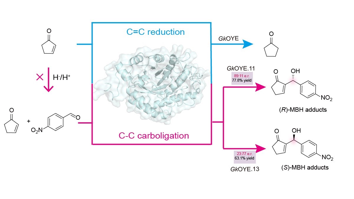 Morita-Baylis-Hillman (MBH)反应是一种重要的C-C键形成反应,是指在亲核催化剂 (例如:活化烯烃)与亲电试剂(例如:醛)之间形成C-C键的原子经济反应,其产物具有广泛的生物活性,包括抗癌、降糖、抗炎、抗病毒、抗菌等。开发高效的酶催化MBH反应方法,将极大促进手性药物合成,推动制药工业的发展。然而,现有化学催化剂的手性高度依赖于底物的结构,限制了MBH反应的广泛应用。在自然界中,还没有发现任何天然酶能有效地催化MBH反应,只有血清白蛋白和脂肪酶等少数酶对MBH反应表现出低水平的混杂活性。为了解决上述问题,刘立明教授带领团队通过计算设计和定向进化结合,开发了一个人工MBHase,具有较高的催化效率和优良的立体选择性。