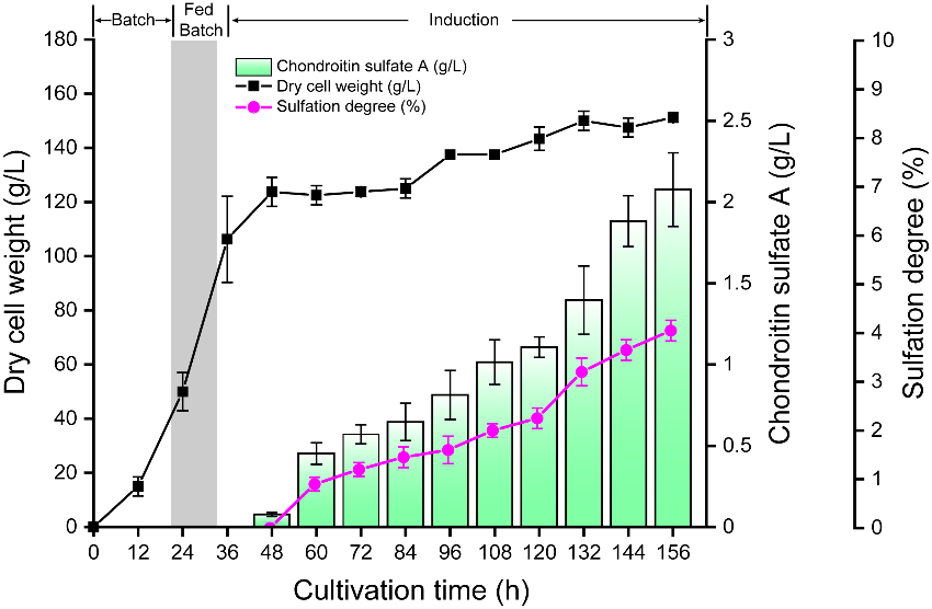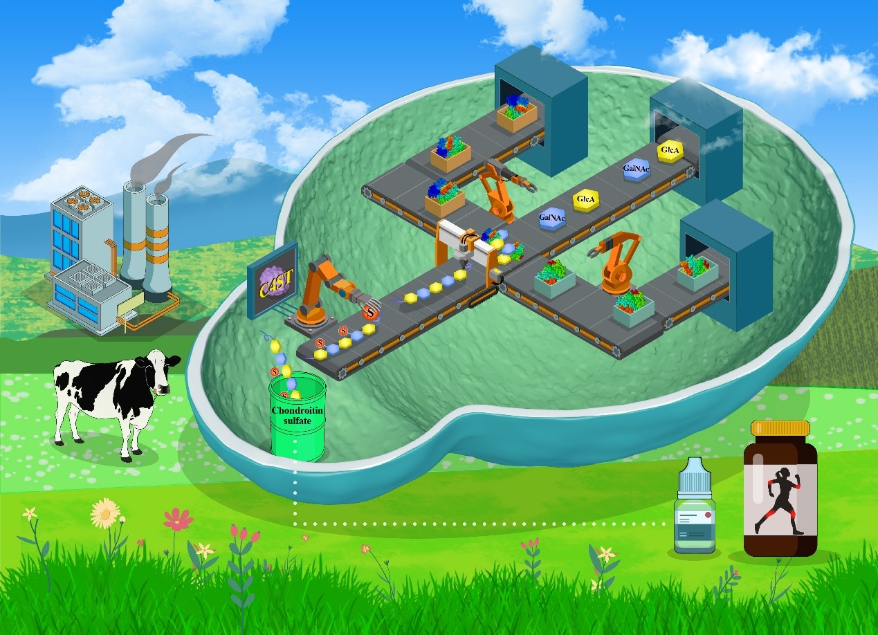 硫酸软骨素(Chondroitin sulfate, CS)是一种广泛分布在软骨组织中的线性糖胺聚糖,由葡萄糖醛酸(GlcA)和N-乙酰半乳糖胺(GalNAc)通过β(1→3)和β(1→4)糖苷键交替连接并经过一定磺酸化修饰而成。CS广泛应用于临床、医疗和营养保健等领域。然而,当前所有商业化的CS都是来自动物组织提取,这种生产模式存在许多问题,例如动物饲养周长、抗生素的使用、动物排泄物的污染、使用高温及酸碱提取以及产品存在潜在的致病因子等。