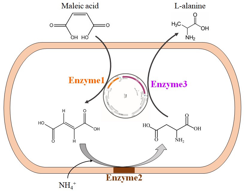 L-丙氨酸可以通过发酵法和酶法催化L-天冬氨酸脱羧合成。由于成本效益,工业上主要是发酵方法合成L-丙氨酸;但是与酶催化相比,发酵法生产L-丙氨酸存在光学纯度差、副产物多、纯化困难等明显缺点。随着L-丙氨酸作为药物前体的需求不断增加,生产具有高光学纯度的L-丙氨酸变得日益重要。