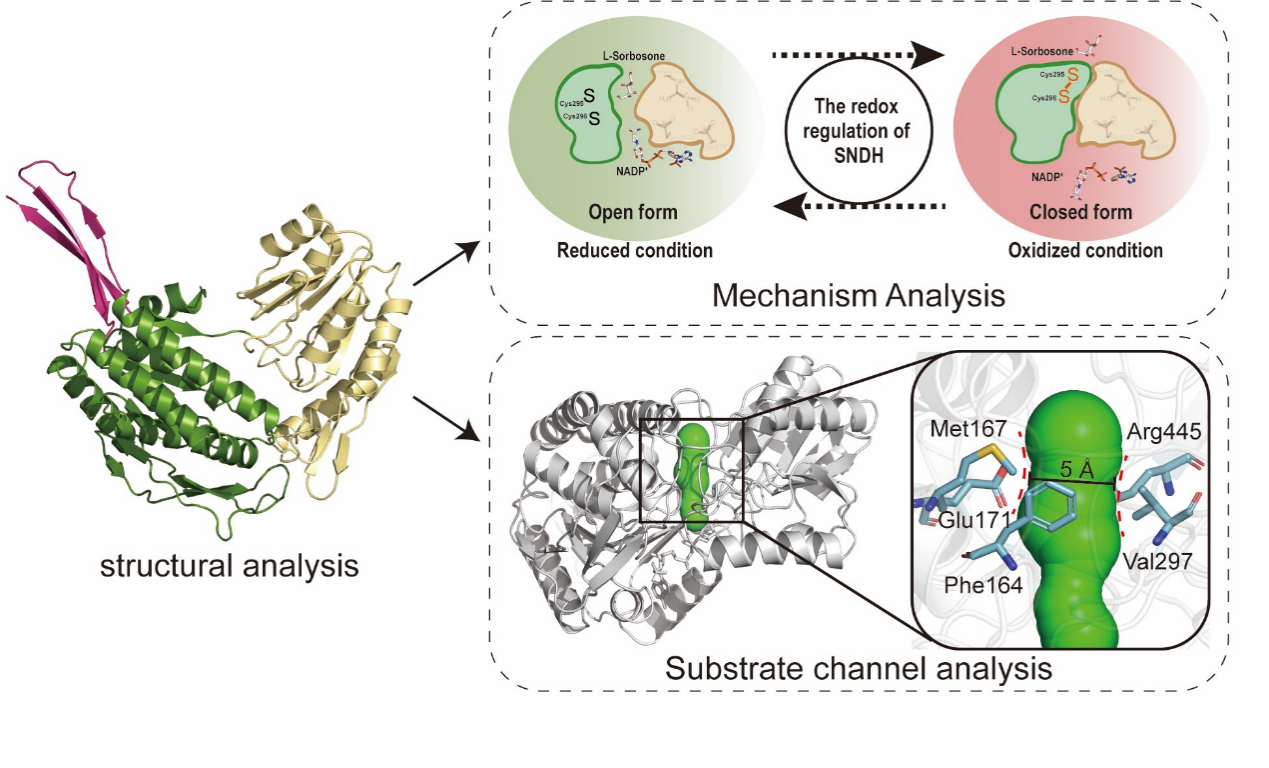 “我们通过外源引入山梨酮脱氢酶与山梨糖脱氢酶,构建出可以直接利用山梨醇一步发酵合成2-酮基-L-古龙酸的工程菌株,这种工程菌株在168小时可以产2-酮基-L-古龙酸68.1 g/L。不仅如此,我们还利用结构生物学解析了山梨醇途径中的关键限速酶——山梨酮脱氢酶,解析了山梨酮脱氢酶的催化机制,通过底物通道工程提升了山梨酮脱氢酶的活性。此外,我们还利用拉伸分子动力学和量子力学等手段对实验结果进行了计算机模拟。”周景文解释,这一研究成果可以为一步发酵维生素C提供了优良的酶元件。