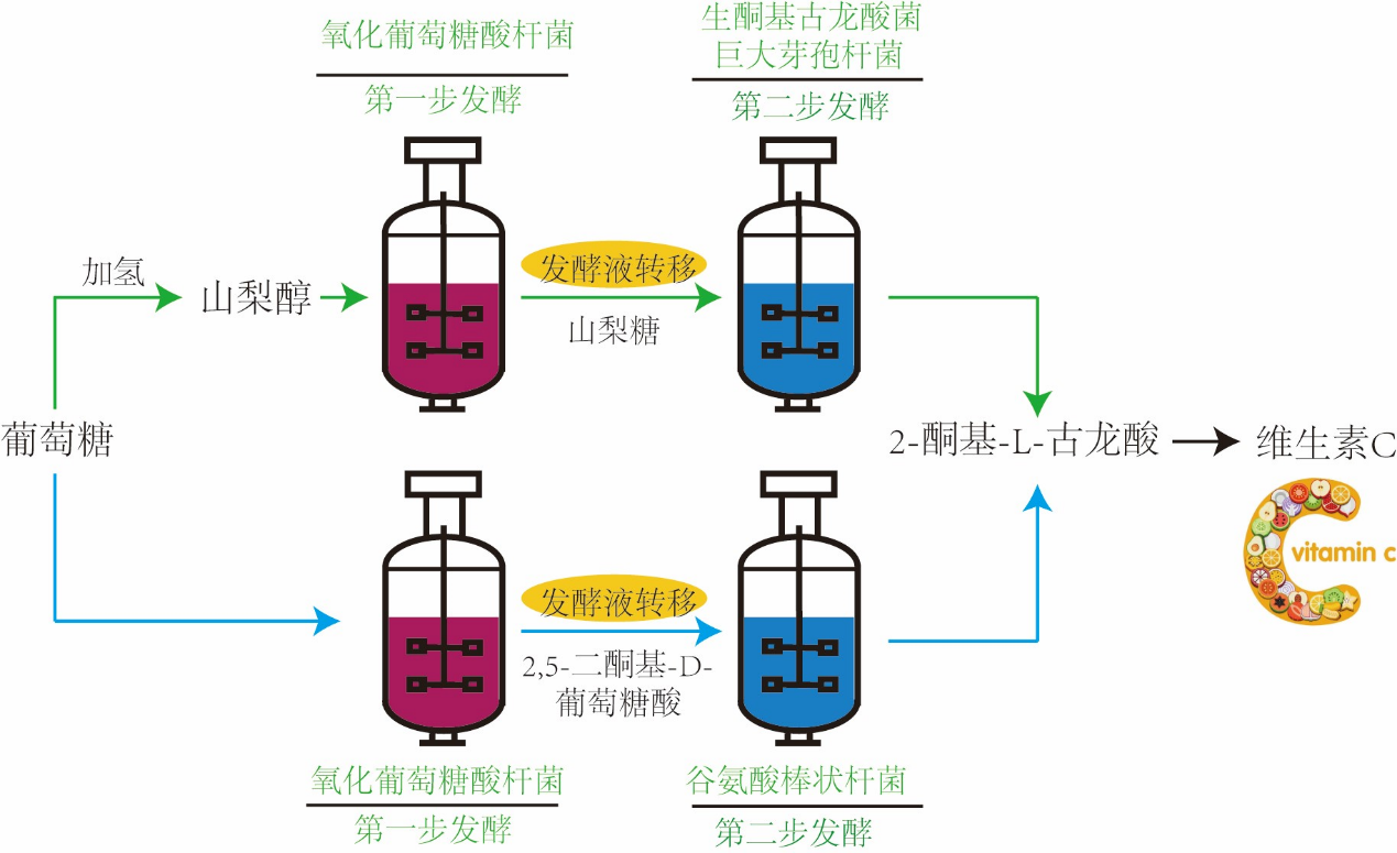 由于过于活跃的化学性质,维生素C无法长期稳定存在于复杂的液体环境中。因此,工业上都是以合成其前体物质2-酮基-L-古龙酸来实现维生素C的大规模生产。周景文告诉记者,目前,2-酮基-L-古龙酸的主要生产方式为三菌两步法,虽然转化率高,但高能耗带来的问题始终是困扰企业的主要难题,如何通过一种细菌一步发酵直接实现2-酮基-L古龙酸的生产一直是困扰维生素C产业的关键问题。于是,团队以氧化葡萄糖酸杆菌为底盘菌株,从山梨醇和葡萄糖两条合成途径同时着手,开发出维生素C单菌一步发酵工艺。