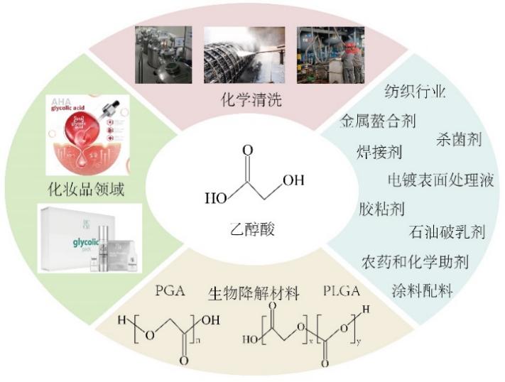 乙醇酸又称为羟基乙酸,主要用做清洁剂、爽肤水和非处方化妆品中的去角质成分。此外,乙醇酸还用于化学清洗、纺织工业以及生产聚乙醇酸-乳酸(PLGA)和聚乙醇酸(PGA)等生物降可降解材料,其相关产品具有生物降解性、生物相容性和低毒性等优点。
