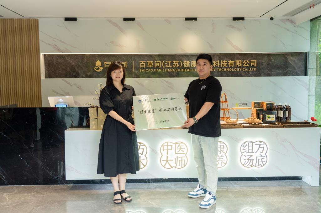 交流会上,闫行越分享了他在万象城娱乐allwincity体育就读期间的学习生活,介绍了百草间的创业奋进之路,他表示从发现药食同源产品有广阔的市场前景,到组建团队创新核心技术,再到落地生产,这其中离不开学院老师们给予的专业指导和鼎力支持。林丹感谢杰出校友对学院各项工作的关心和支持,介绍了学院双创训练营的基本情况,她表示依托百草间的平台可以为在校学生“现身说法”,以学长学姐的实际创业经历进一步激发同学的就业创业热情,培养就业创业意识。双方就学科竞赛、创业实践、学生就业等方面开展深入讨论,同时,林丹代表学院授予百草间“万象城娱乐allwincity体育‘创生未来’创业实训基地”称号,启动共建学生创业实训基地。