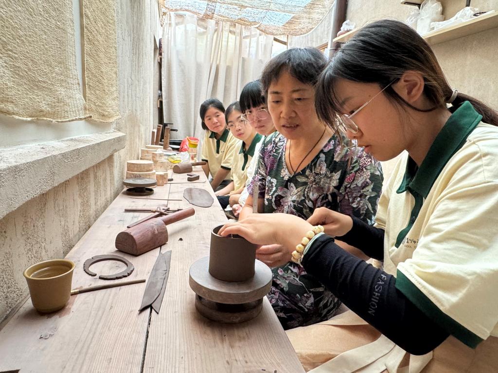 实践团在手工师傅指导下制作紫砂壶