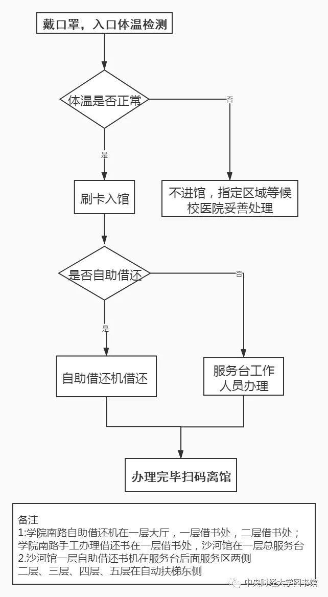 开学后,读者可入馆借还书。在使用自助借还机办理时,需保持一米以上安全距离,有序排队;不能使用自助借还机办理的,请到服务台找工作人员办理。学院南路馆读者需要入库找书时,可由一层借书处进入书库查找书籍。借还书服务流程见图1。