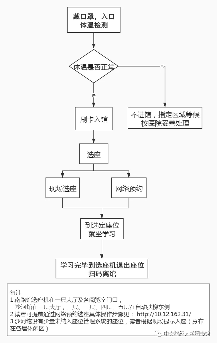 2.读者入馆须全程佩戴口罩,在图书馆入口处测量体温,体温正常者刷卡入馆。体温异常者(高于37.3℃),请在指定区域等候医务人员妥善处理。