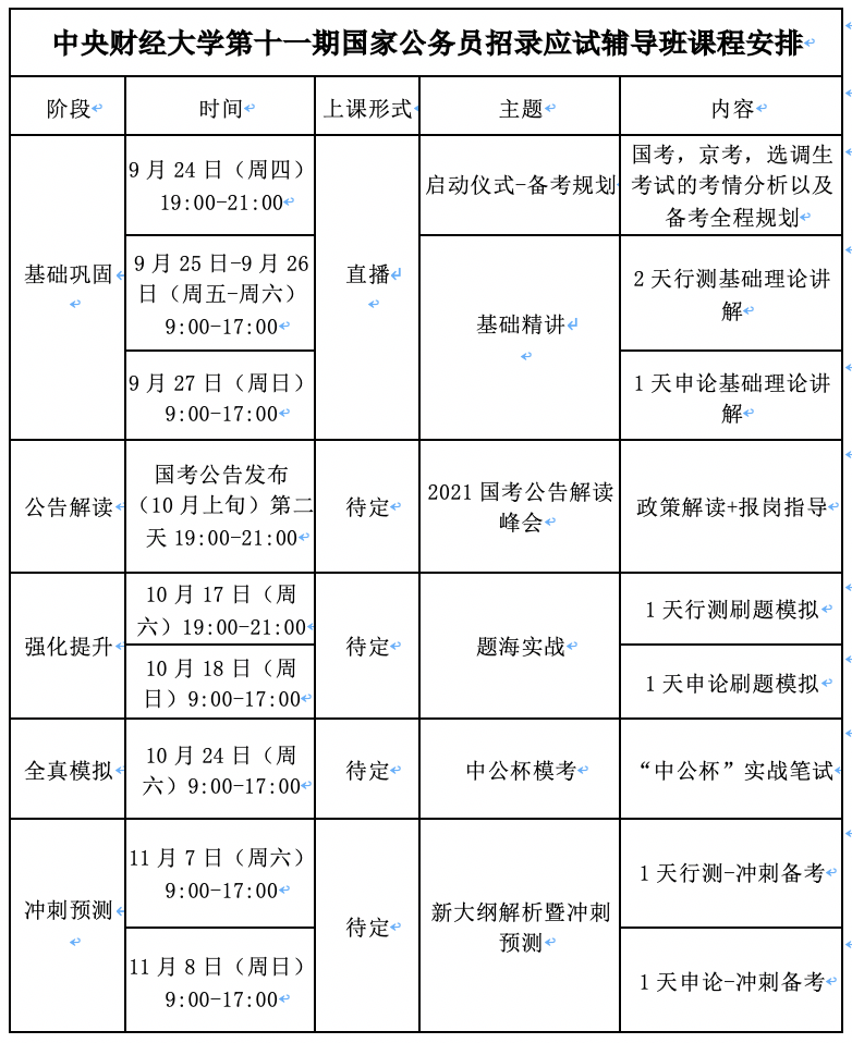 2.公告解读。2021年国家公务员考试公告预计10月上旬发布。通过对于公告的解读以及职位的解析帮助学生对于今年的考试形式有一个清晰地认识和深入地了解。