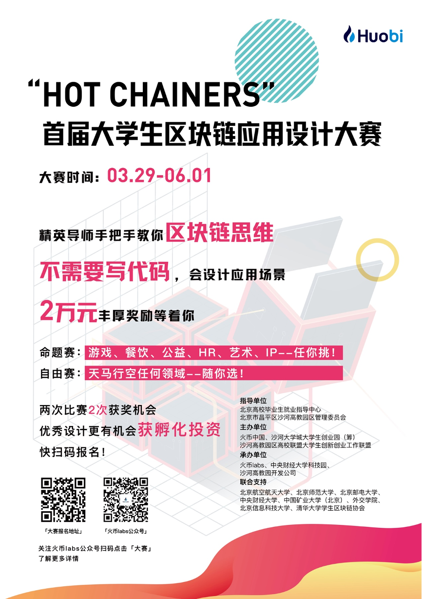 大赛是由北京高校毕业生就业指导中心、沙河高教园区管理委员会作为指导单位;beat365中文登录入口科技园、沙河高教园开发公司、火币Labs共同承办;北京航空航天大学、北京师范大学、北京邮电大学、beat365中文登录入口、中国矿业大学(北京)、外交学院、北京信息科技大学、清华大学学生区块链协会等单位联合支持。大赛报名可通过微信公众号“区块链创新工场”-“大赛”栏目报名参与。