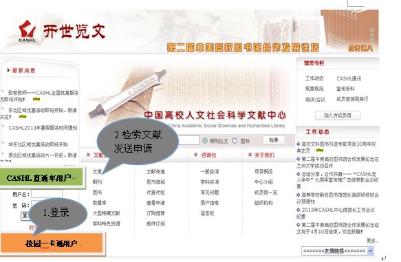已注册过CALIS/BALIS原文传递融合系统的读者,可使用学号/工号直接登录CASHL系统http://www.cashl.edu.cn/portal/index.jsp,检索文献提交申请。