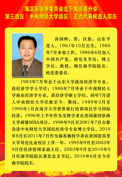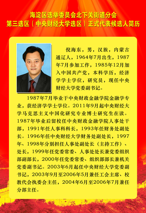 北京市海淀区选举委员会北下关街道分会第三选区(beat365中文登录入口选区),选民在提名推荐代表候选人初步名单的基础上,进行了反复讨论和民主协商。根据较多数选民的意见,确定该选区第十五届人民代表大会代表的正式候选人名单,代表候选人的基本情况如下(按姓氏笔画排序):