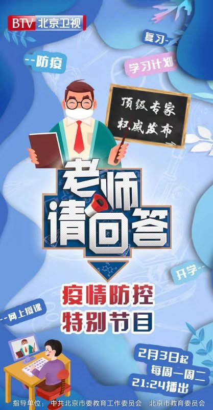 为进一步加强在家学生思想教育和心理疏导,向学生讲清楚延期开学以及不离家、不返校的必要性,指导学生在家期间的学习生活,市委教育工委、市教委联合北京电视台录制了《老师请回答》特别节目,2月3日起每周一、周二21:18在北京卫视播出,邀请顶级专家权威发布必备防疫、学习、生活指南。